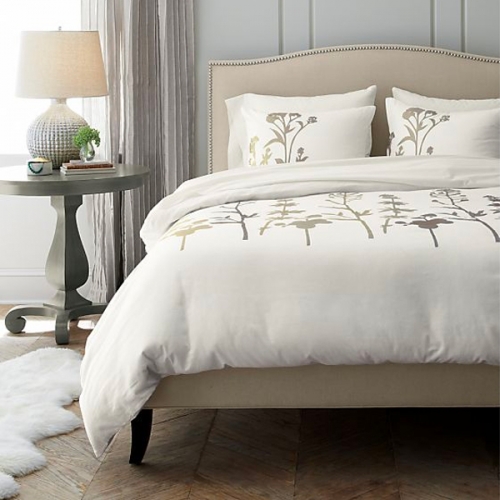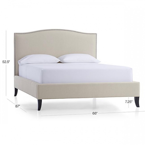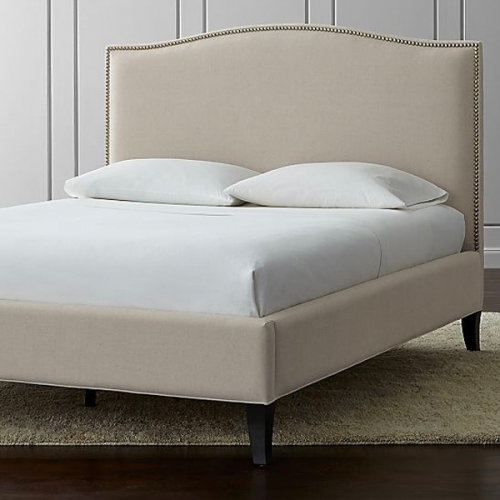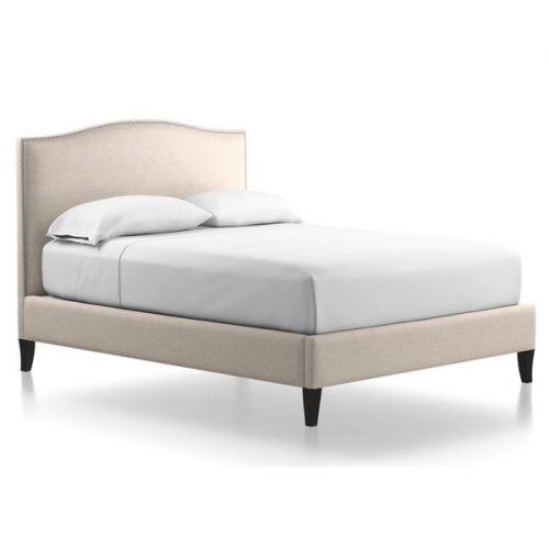 The Colette queen platform bed brings grace and sophistication to the bedroom with an understated curved camelback in a soft natural linen blend. Curved, solid maple legs are finished in black, with signature, hand-applied nailheads in brushed pewter adding the final refinement.